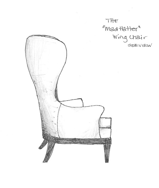 I knew right away that the chair we're creating would be the "Mad Hatter" Wing Chair. The images & memories from my childhood are so ingrained in me that I figured, why fight it? and why not just go with it? So, every piece in the collection is named for what strikes me when I think of it. (And not all make sense, which is why I'll be sure to explain ;) Here's a sideview sketch I did of the Mad Hatter: